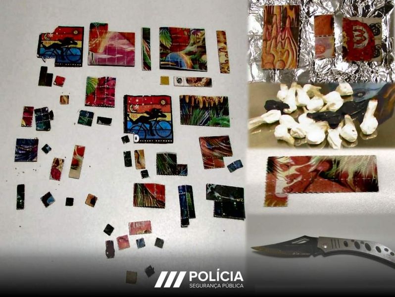 O detido tinha na sua posse 412 doses de Cocaína; 12 doses de Haxixe; 446 gramas de Liamba; 288 selos de LSD e 24 pastilhas de MDMA. F...