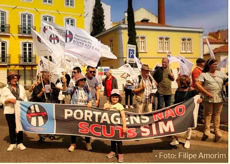 Ao som de bombos e concertinas, os participantes no protesto carregam bandeiras brancas, mostrando o seu desagrado contra as portagens na...